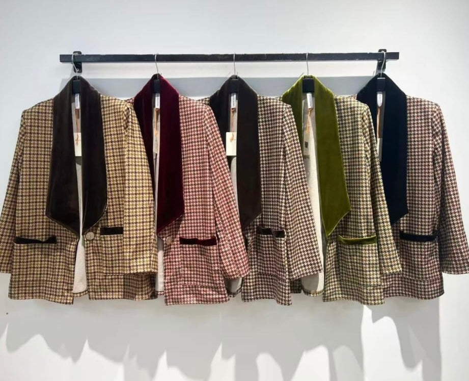 Blazer con estampado pata de gallo. Cuello y bordados del bolsillo aterciopelados.