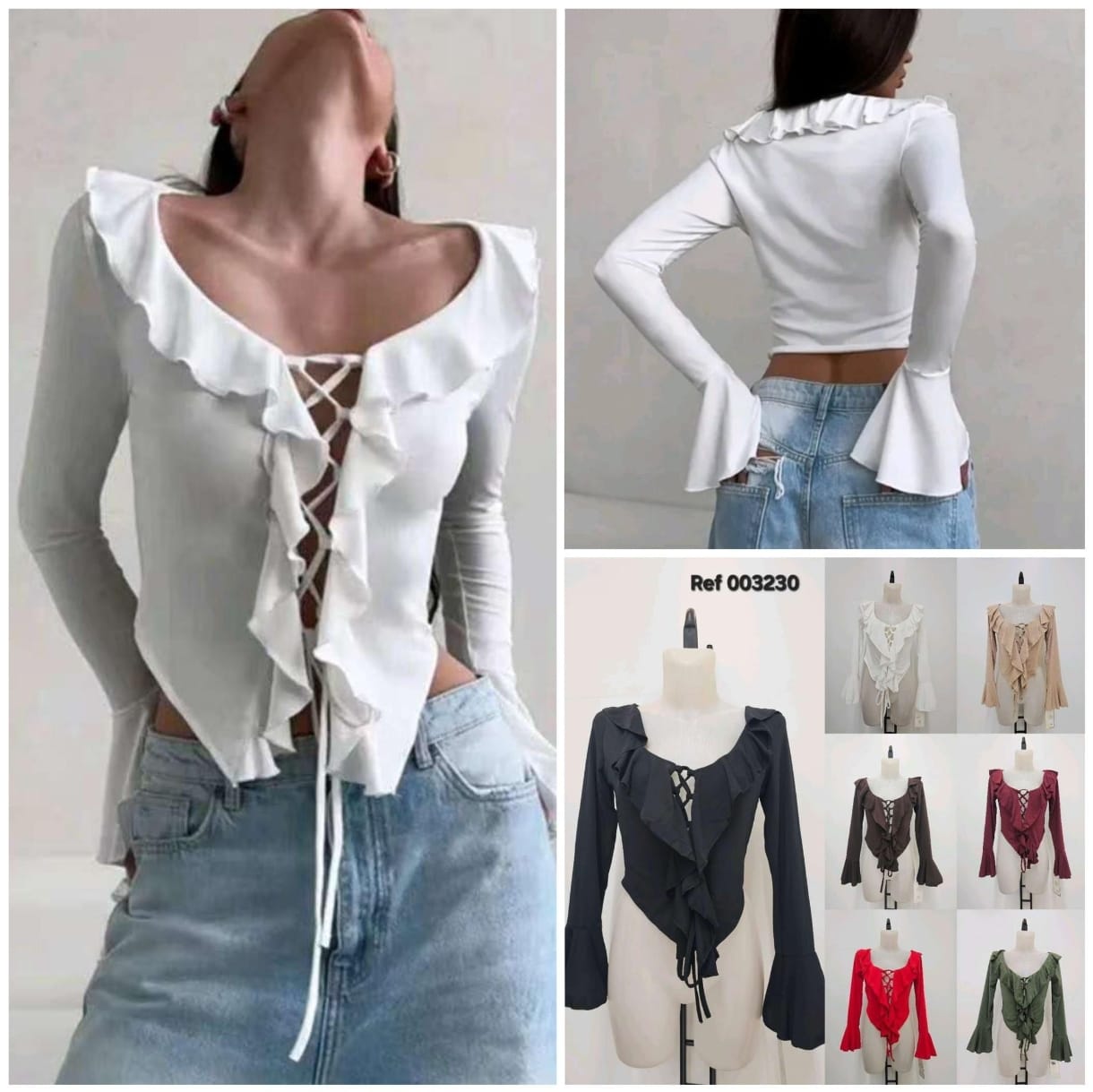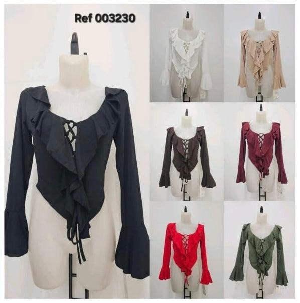 Camisa abierta con cerrado de cuerdas y volantes frontales y en el cuello. Mangas acampanadas.