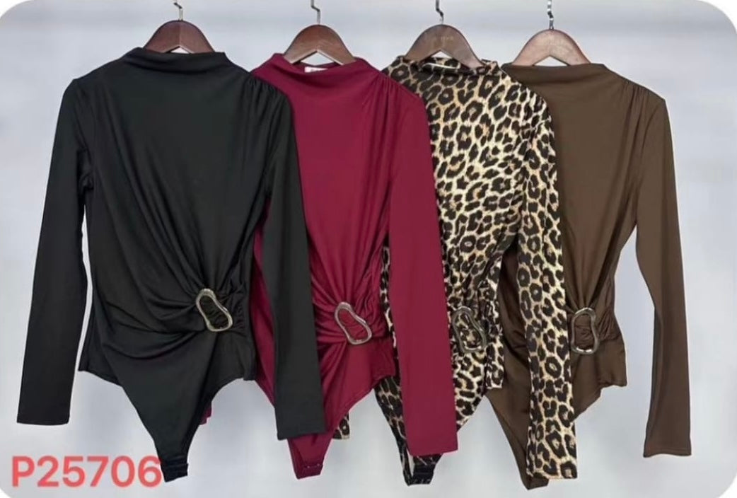 Body satinado de cuello alto y adorno dorado en el lateral.