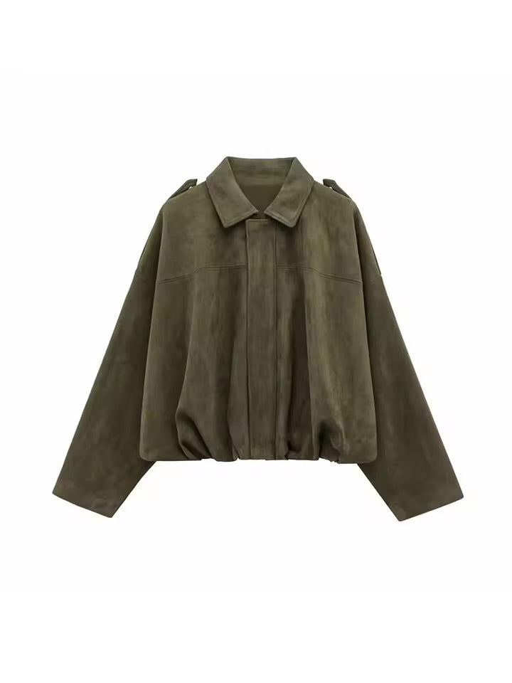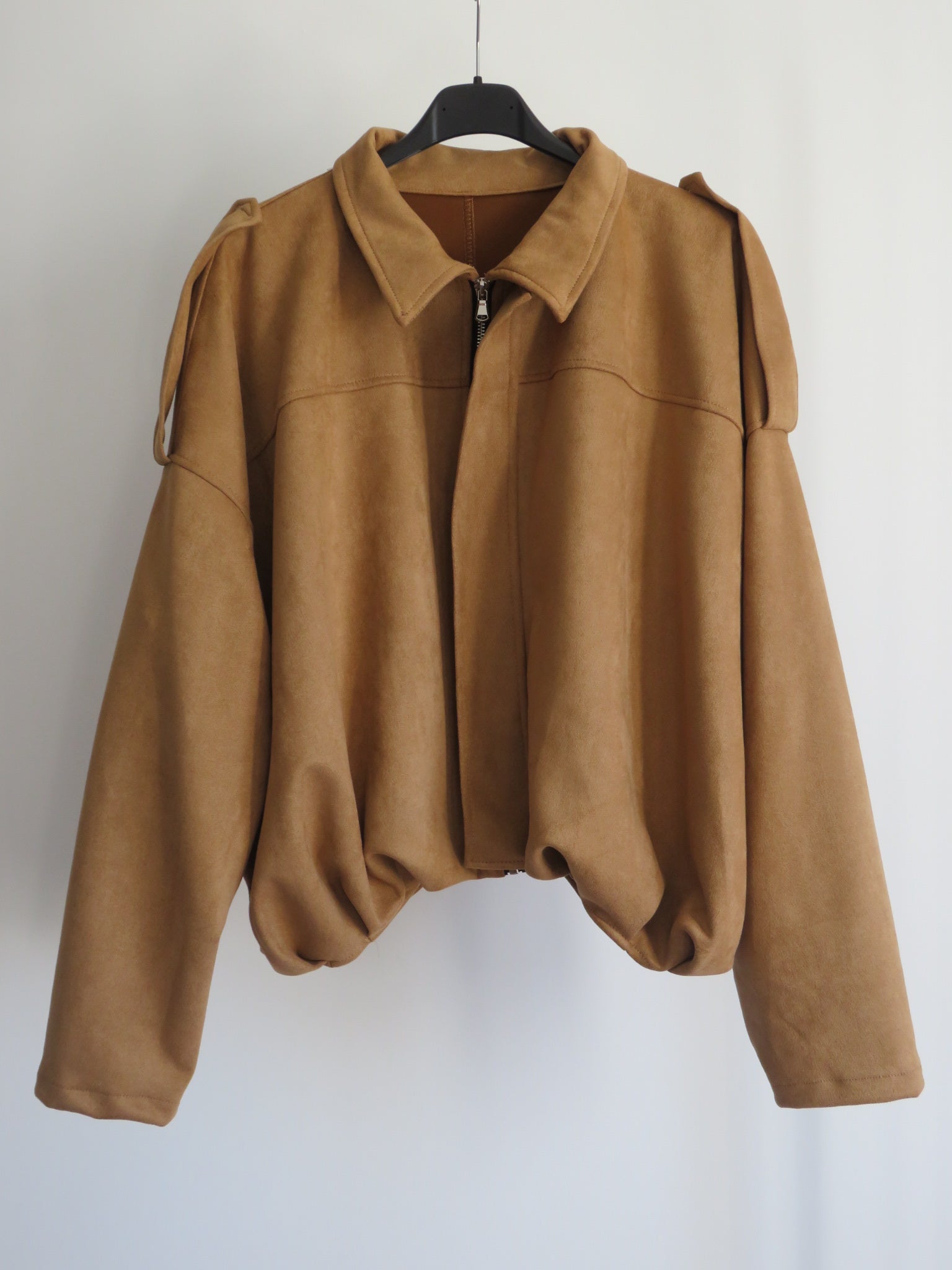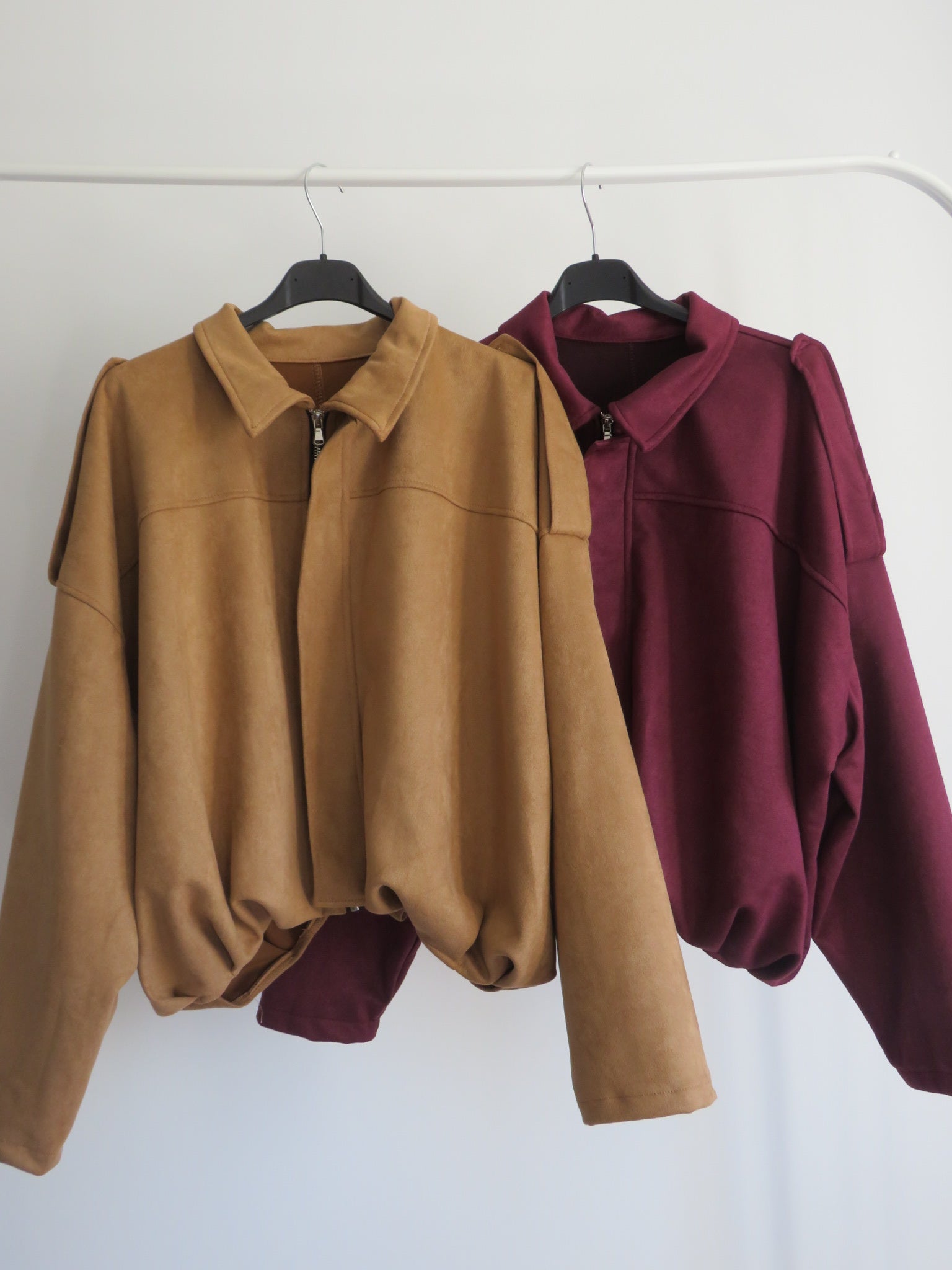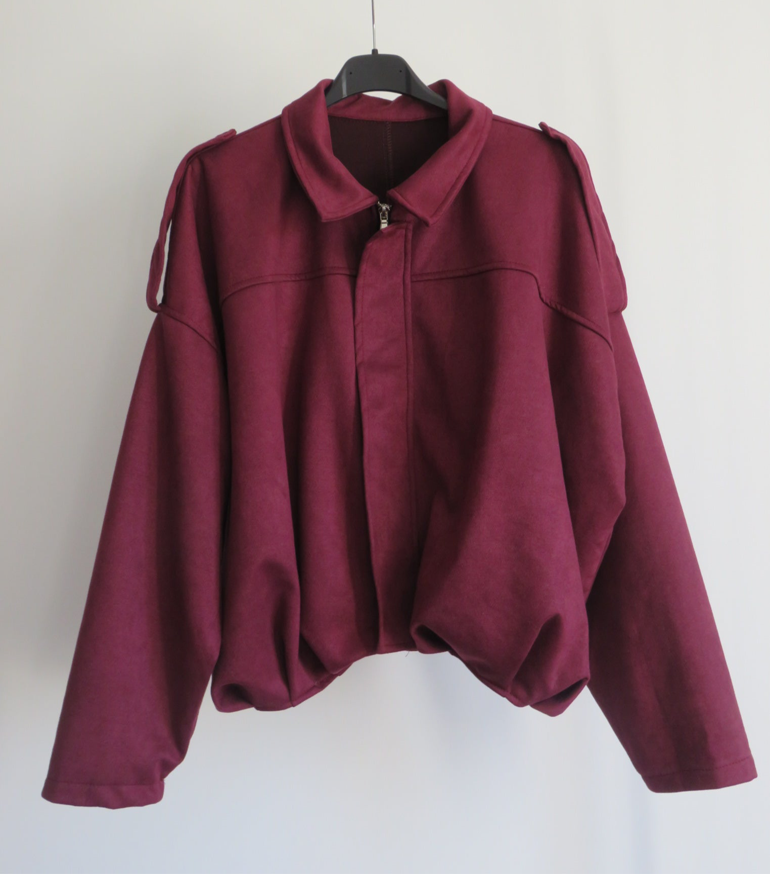 Chaqueta de mujer estilo oversize confeccionada en tejido efecto ante, suave y ligero. Con cuello camisero, trabillas en los hombros y cremallera frontal oculta, es una prenda versátil que combina comodidad y tendencia. Disponible en color camel y burdeos, ideal para looks casuales y urbanos.