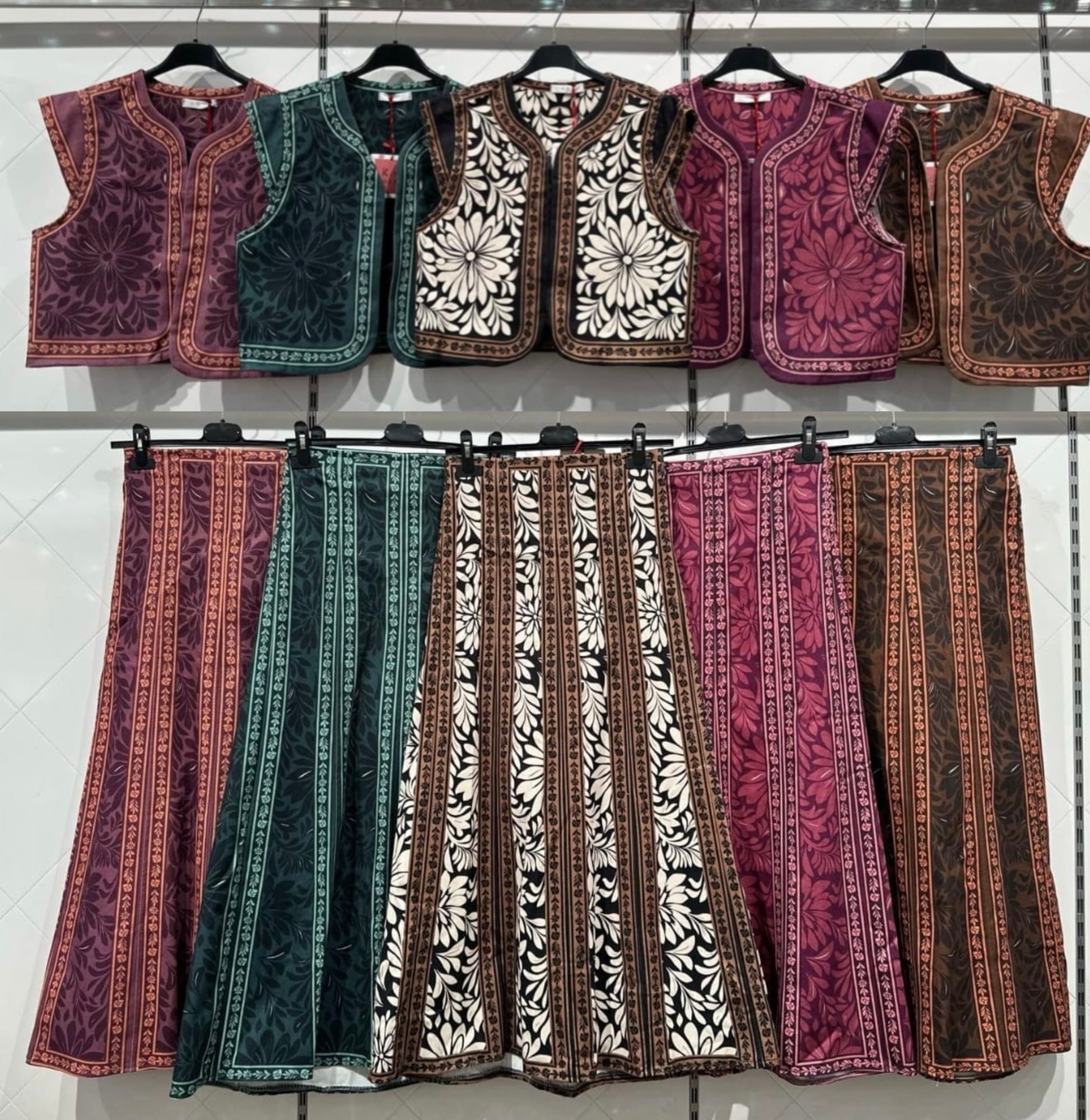 Este conjunto de falda larga y chaleco sin mangas es la combinación perfecta de estilo bohemio y sofisticación. Confeccionado en tejido estilo vaquero, perfecto para el otoño, destaca por sus estampados geométricos y florales de inspiración étnica, que aportan un aire original y artesanal a tu look.