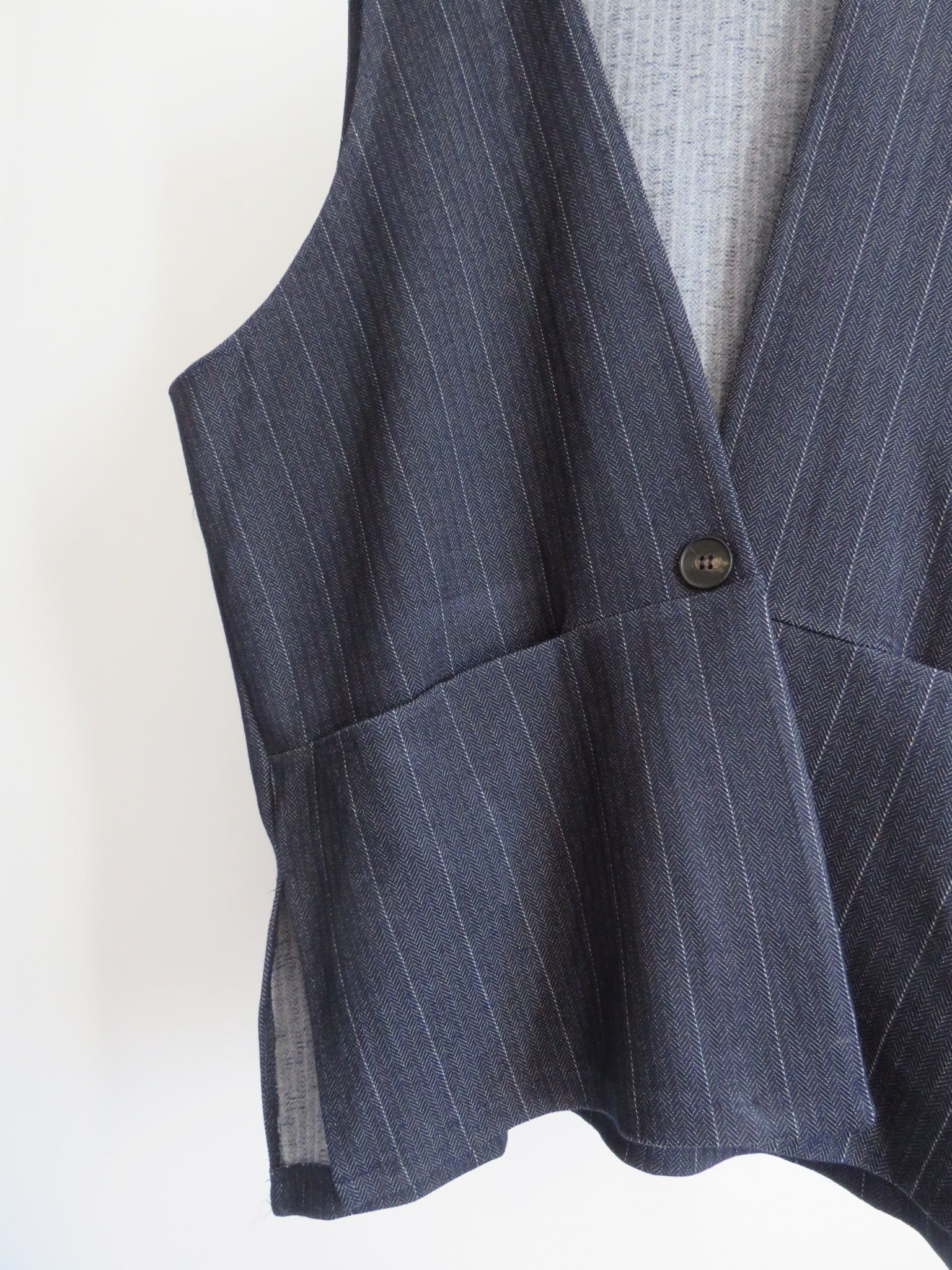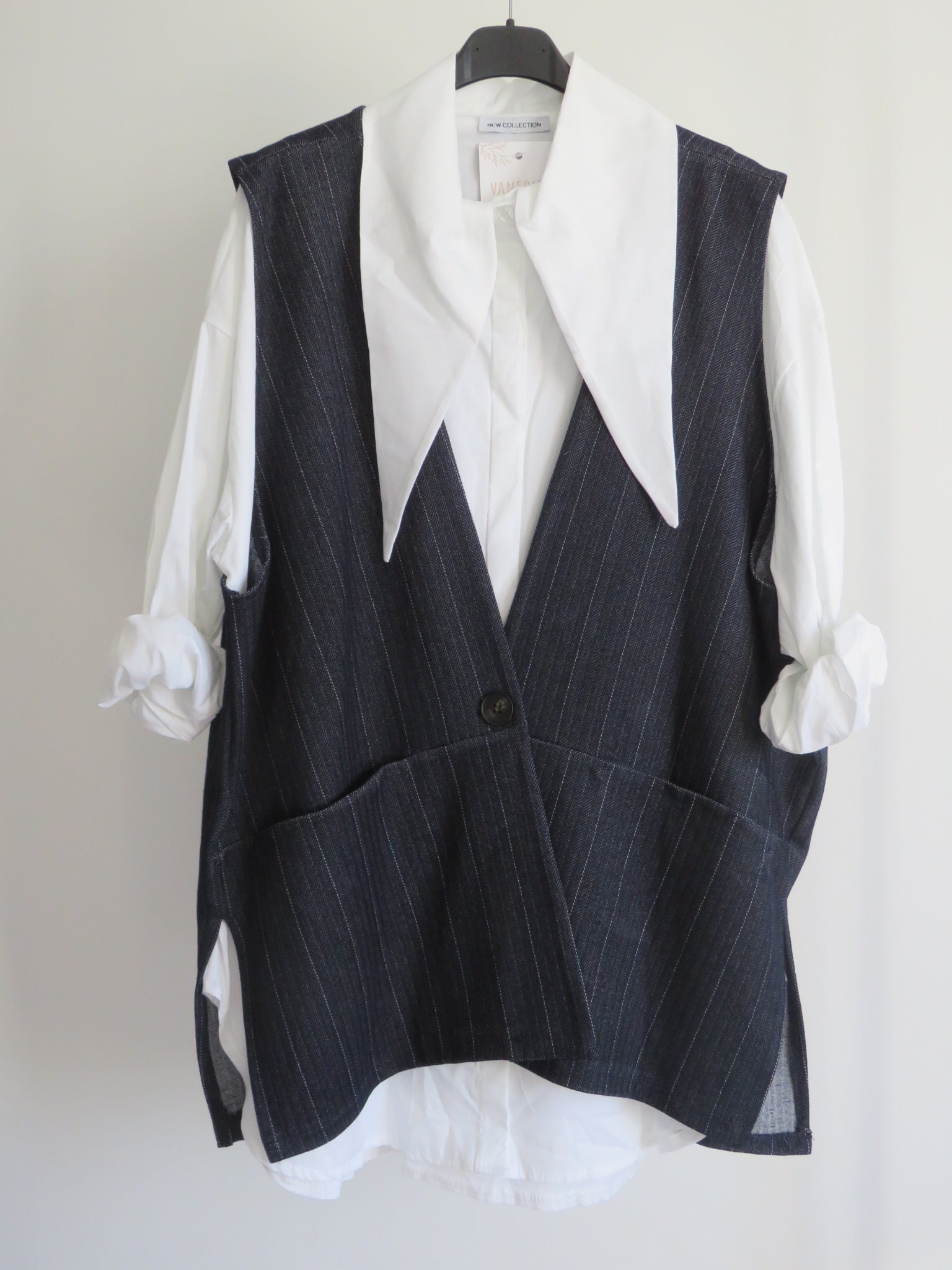 Un look moderno y diferente que combina la estética del denim con la comodidad de un tejido ligero y suave. Este conjunto de dos piezas incluye un chaleco con corte recto y solapa pronunciada sobre camisa blanca integrada, y un pantalón ancho de tiro alto con cinturilla elástica y lazo ajustable.