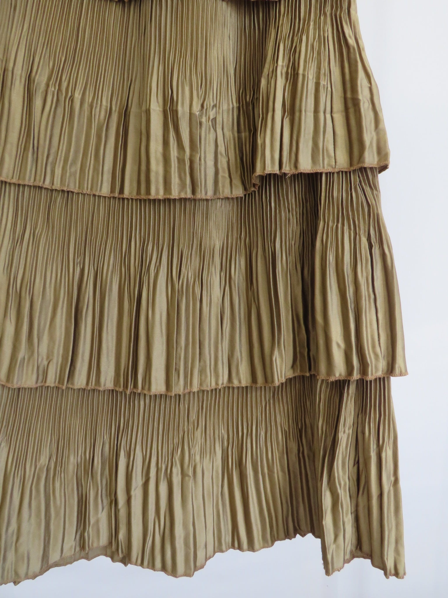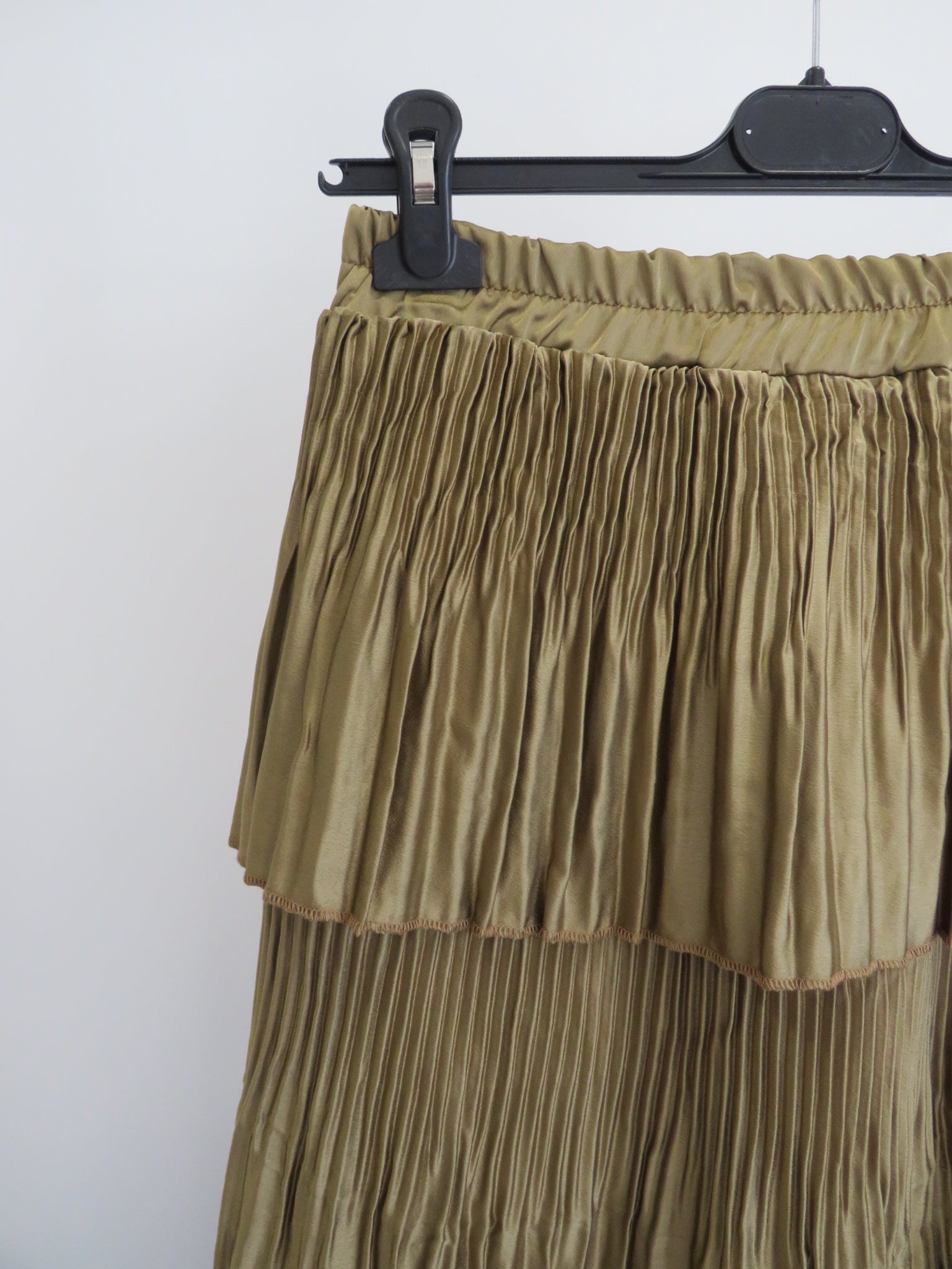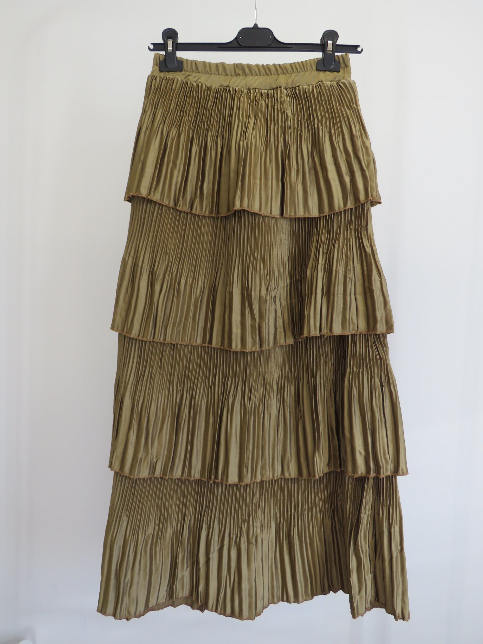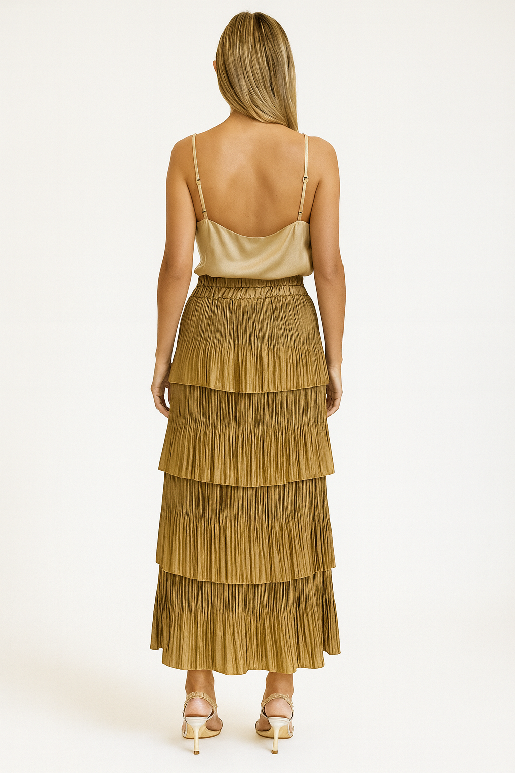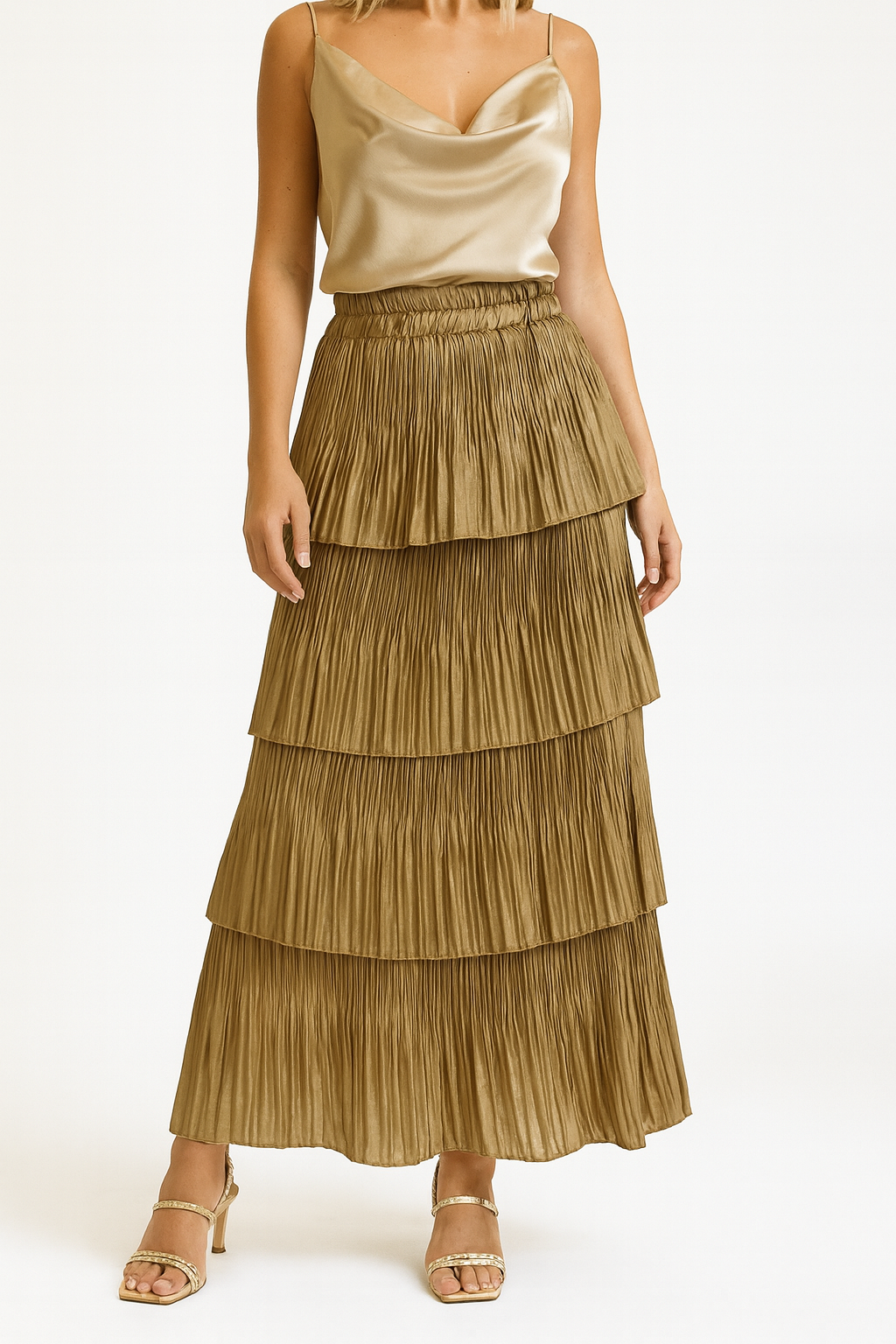 Falda sofisticada y atemporal, confeccionada en un tejido ligero con acabado satinado que aporta brillo y movimiento natural. Su diseño de capas plisadas en volantes escalonados crea volumen y su cintura elástica fruncida asegura comodidad y un ajuste perfecto. Es la opción ideal tanto para eventos especiales como para looks de noche con un aire distinguido.