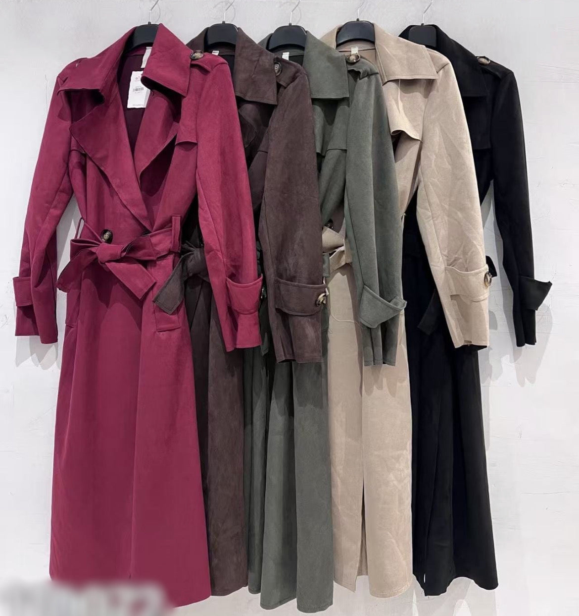 Gabardina de antelina, de tacto suave y agradable. Larga, con bolsillos y cinturón.