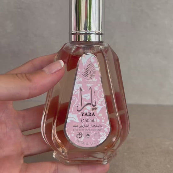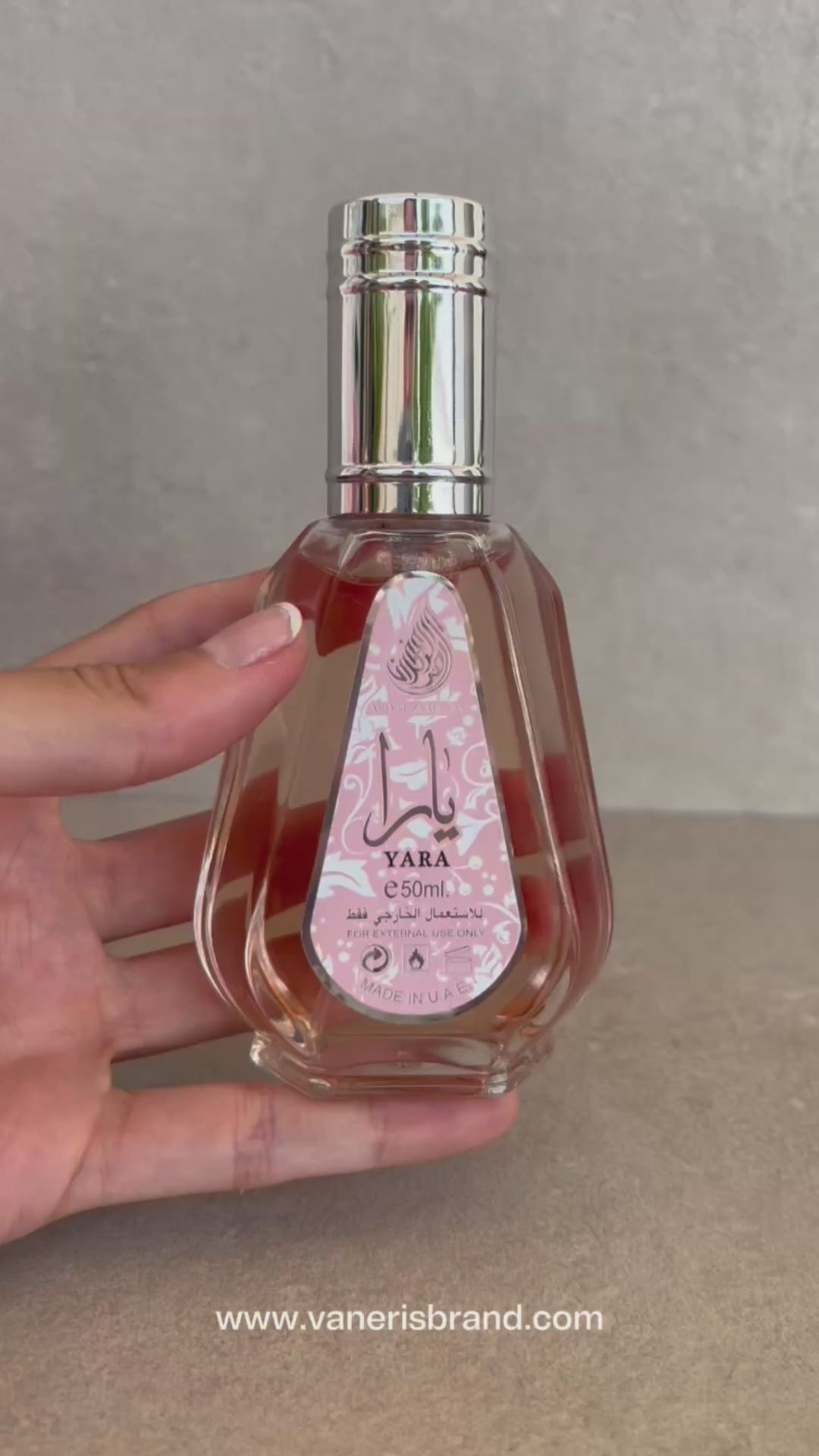 Descubre la esencia del encanto oriental con Yara, un perfume elegante y cautivador, presentado en un frasco de 50 ml con un diseño sofisticado y femenino, esta fragancia combina el arte tradicional árabe con un toque moderno y refinado.