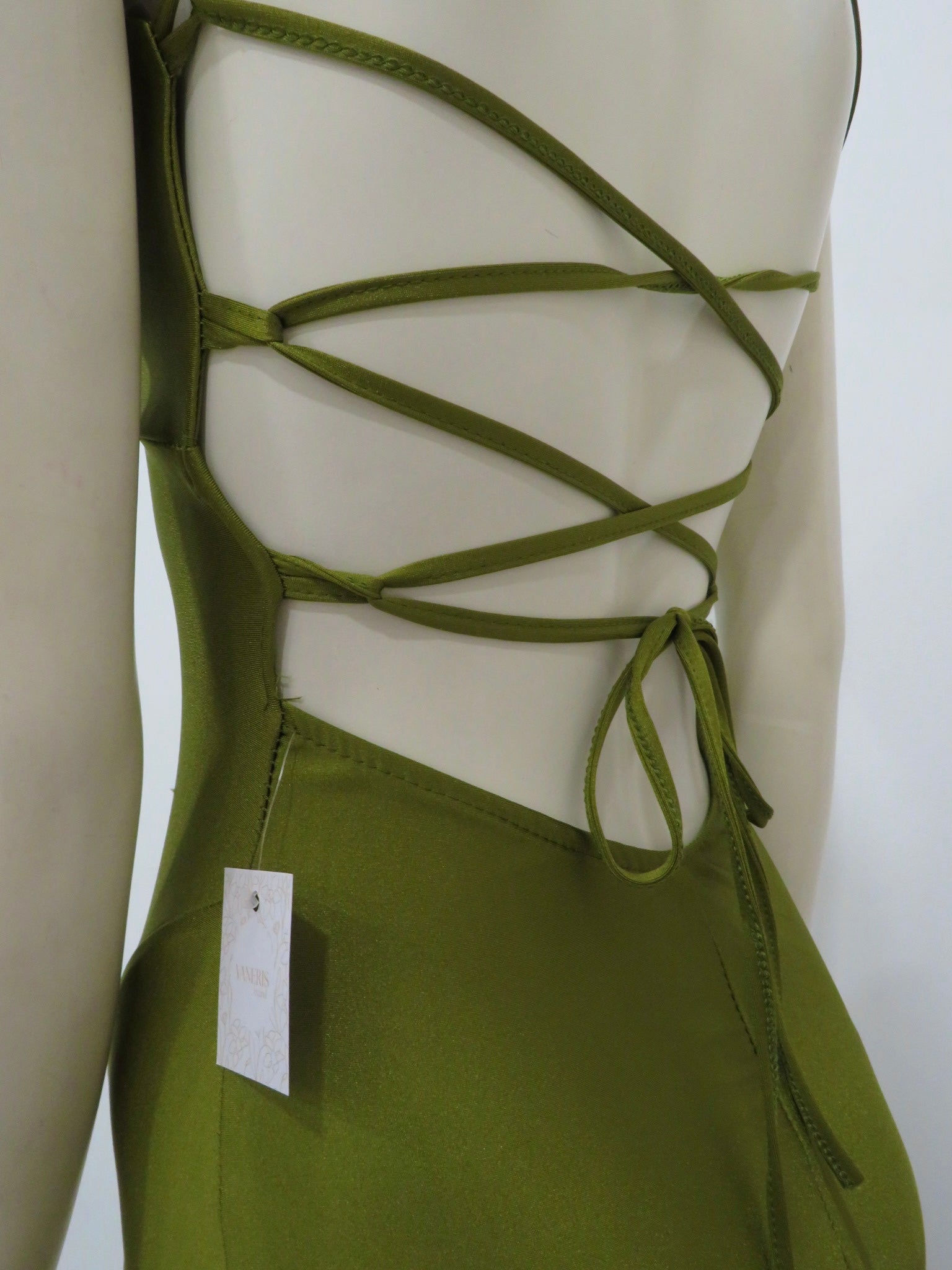 Su escote en pico realza el busto con delicadeza, mientras que la espalda descubierta, atada con finas cuerdas ajustables, añade un toque sensual y sofisticado. La abertura lateral en la falda insinúa la pierna con cada paso, creando un juego de movimiento y seducción.