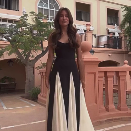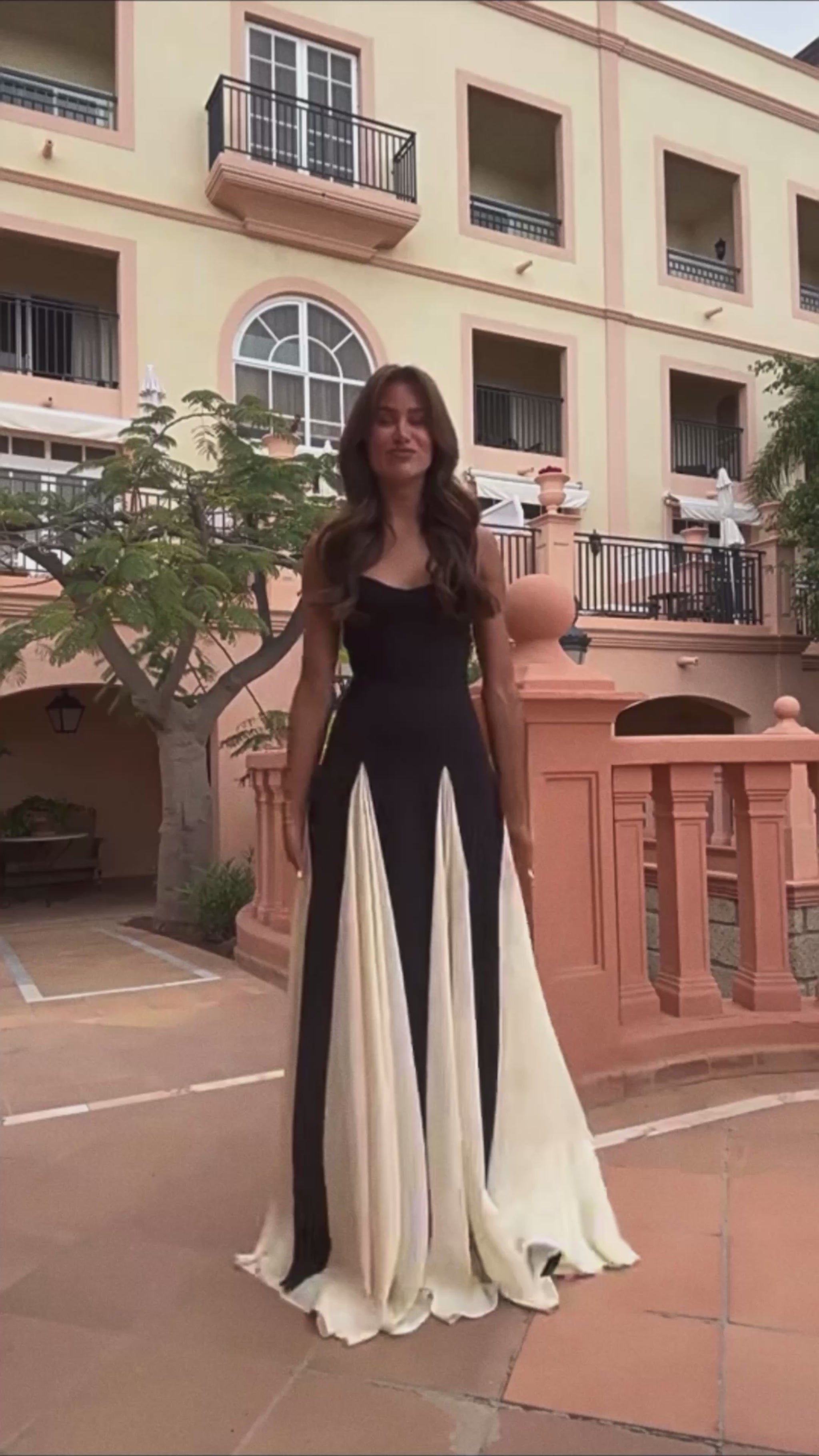 Eleva tu armario con este vestido de noche blanco y negro, ideal para eventos de trabajo, galas y cenas forales. Con un elegante corpiño negro y una falda monocromática fluida, este elegante vestido es ideal para reuniones, eventos o fiestas formales.